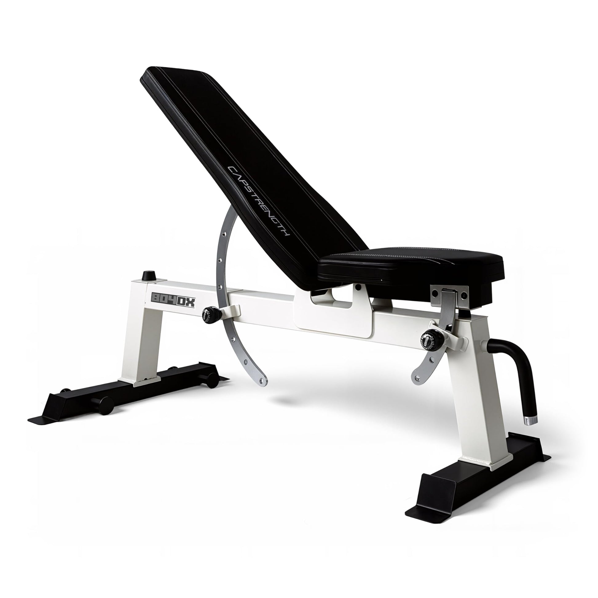 The CAP Deluxe Utility Bench in red incorporates all of the necessary features and functions found on traditional weightlifting utility benches and incorporates additional features to take advantage of other training methods. The band/tube posts, an industry first feature, allows the CAP Deluxe Utility Weight Bench to be used with resistance tubes or bands to incorporate low impact resistance exercise alternatives to your exercise program (great for rehabbing and senior strength building). Use this bench as a key component in dumbbell training routines. Perform a number of upper and lower body exercises while incorporating dumbbell use to hit goals and build / maintain muscle. This bench can also be used as the center piece for core exercises. Great for leg lifts, crunches, twists and more. Add the CAP Barbell FM-905Q Color Series Exercise Rack or FM-8000F Color Series Deluxe Power Rack to color coordinate and customize your home gym (not included). Recommended maximum weight capacities for the bench are 500 lb (flat position, including user) and 400 lb (inclined positions, including user). The unit is for indoor use only.